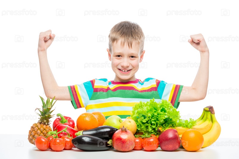 Мальчик-спортсмен показывает бицепсы за столом с кучей свежих овощей и фруктов, изолированных в студии
