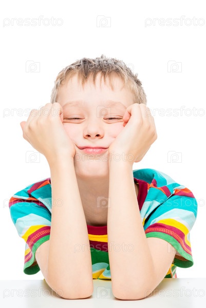 Мальчик в полосатой футболке за столом на белом фоне изолирован