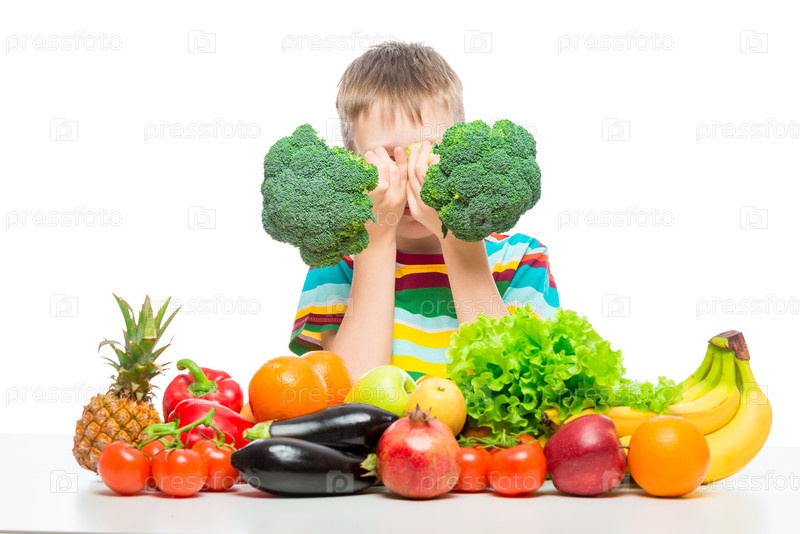 Мальчик играет с брокколи и кучей овощей и фруктов позирует в студии изолированно на белом фоне
