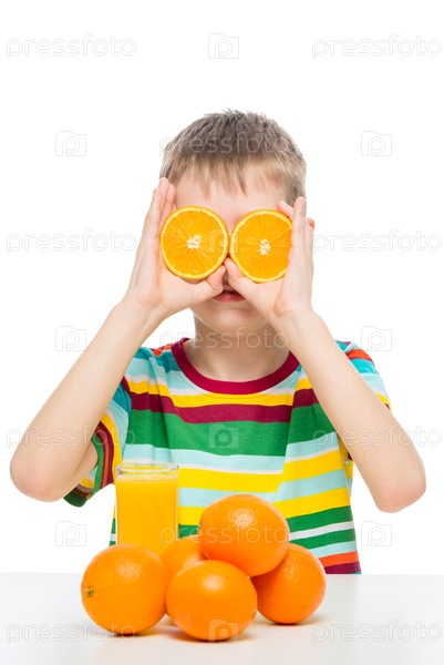 Забавный мальчик с апельсинами и свежим соком позирует на белом фоне