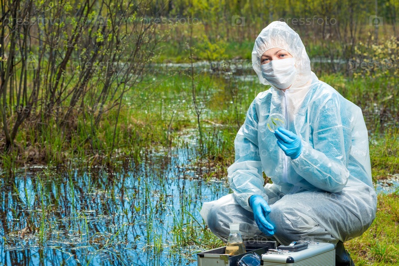 Эколог-химик с образцами воды и растений из лесной реки проводит исследования