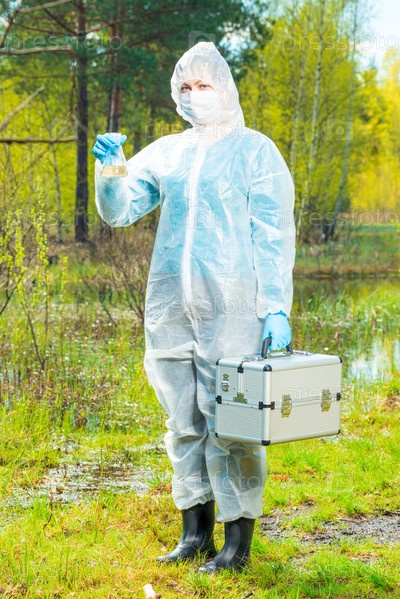 Забор воды для исследований в лаборатории, эколог в защитной одежде у источника воды в лесу