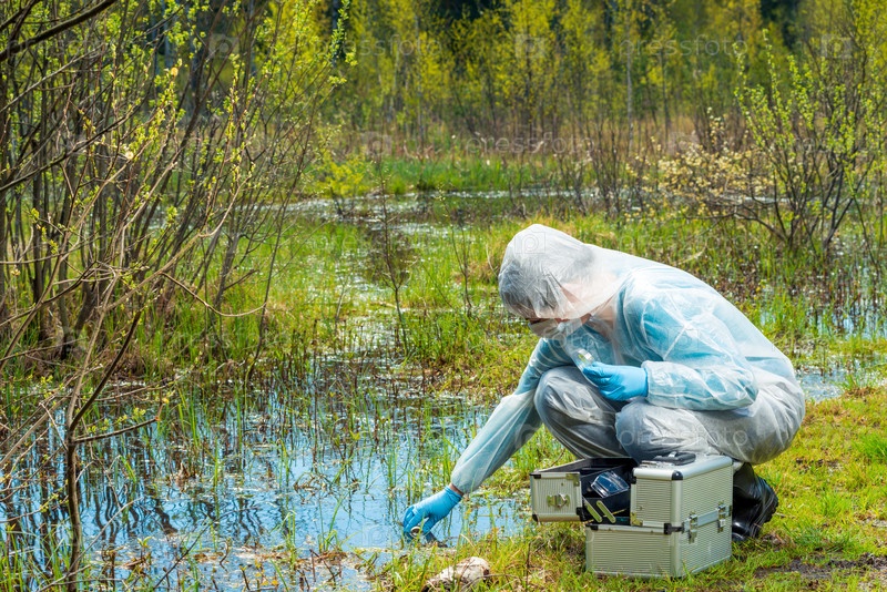 Эколог берет образец воды из лесного водоема в защитной одежде
