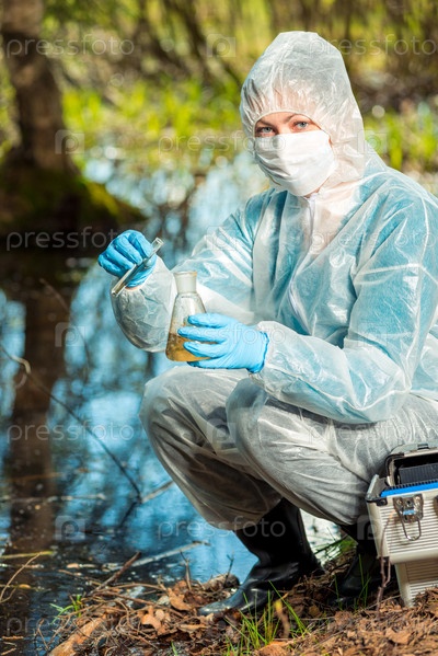 Эколог и с пробирками и колбами анализирует воду в лесном пруду