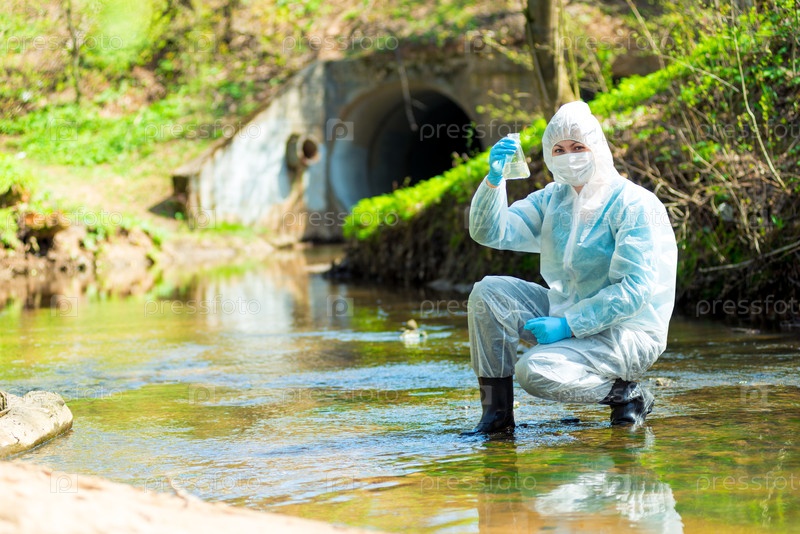 Женщина-эколог берет воду из сточных вод