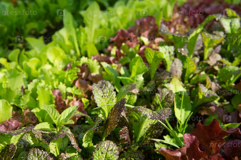 Ряды салата и горчицы разных цветов в садовой кровати