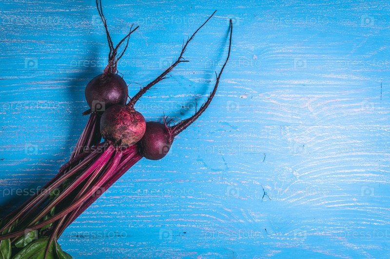Куча свежей свеклы на старом синем деревянном столе. Копируйте пространство. Здоровая еда. Сырые овощи