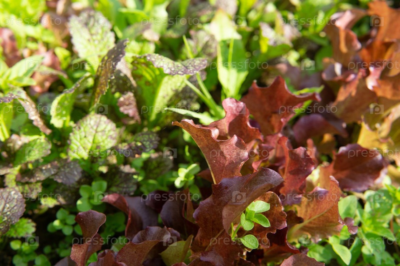 Ряды салата и горчицы разных цветов в садовой кровати