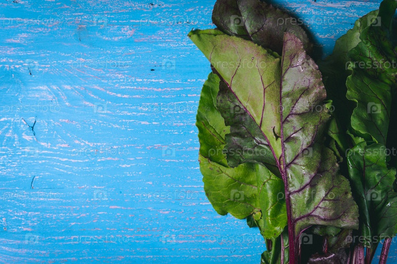 Свекольные топы на старом синем деревянном столе. Копируйте пространство. Здоровая еда. Сырые овощи