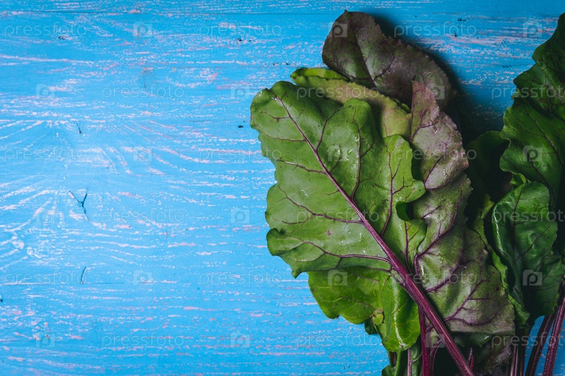 Свекольные топы на старом синем деревянном столе. Копируйте пространство. Здоровая еда. Сырые овощи