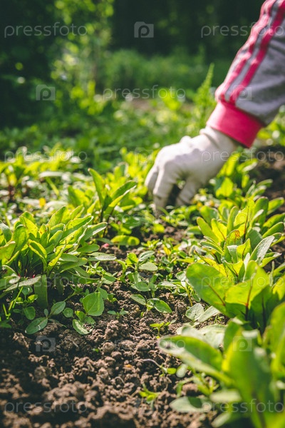 Женщина сорвала руки в перчатках растения в саду