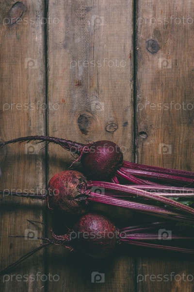 Куча свежей свеклы на деревянном деревенском столе. Копируйте пространство. Здоровая еда. Сырые овощи