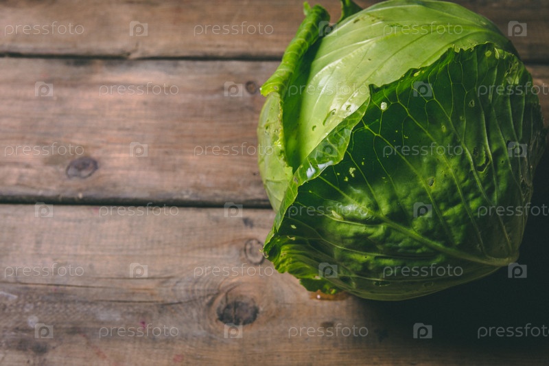 Свежая капуста на деревянном деревенском столе. Копируйте пространство. Здоровая еда. Сырые овощи