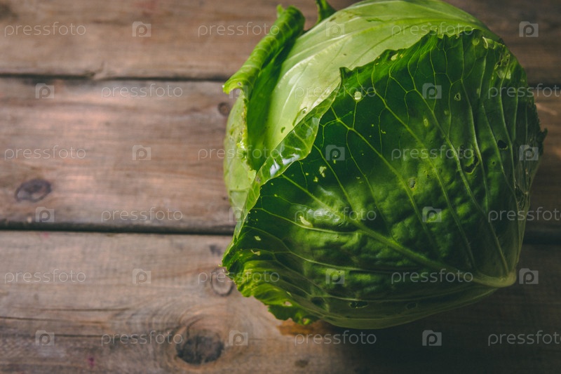 Свежая капуста на деревянном деревенском столе. Копируйте пространство. Здоровая еда. Сырые овощи