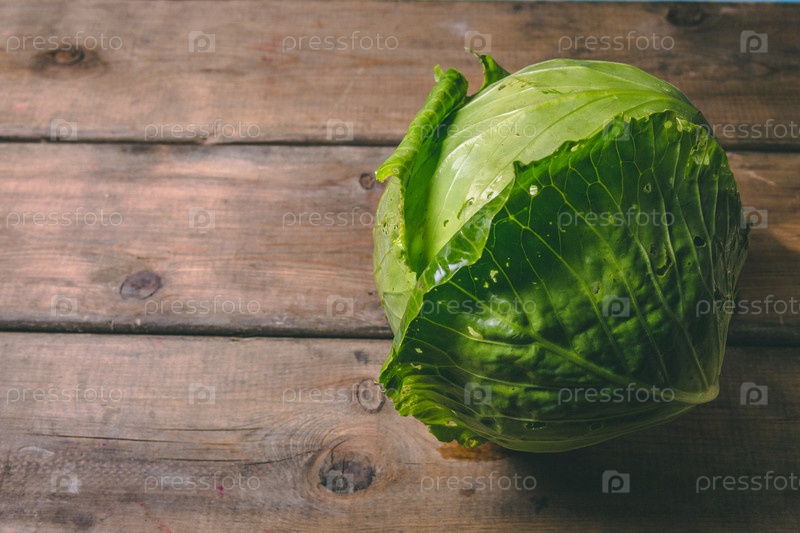 Свежая капуста на деревянном деревенском столе. Копируйте пространство. Здоровая еда. Сырые овощи