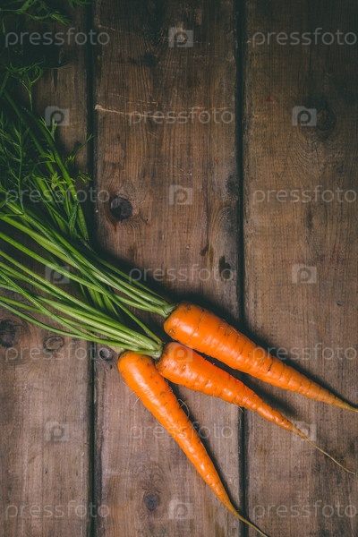 Свежая вкусная морковь на деревянном деревенском столе. Здоровая еда. Овощи