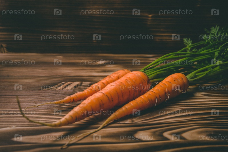 Свежая вкусная морковь на деревянном деревенском столе. Здоровая еда. Овощи