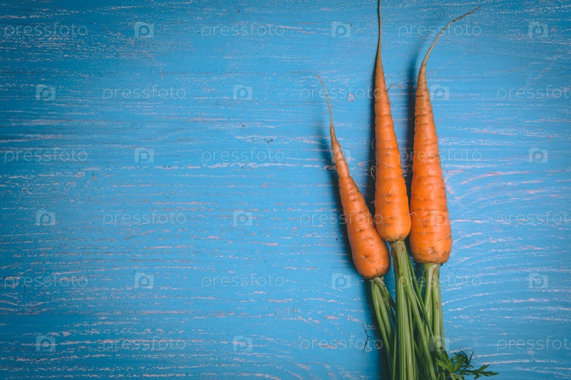 Свежая вкусная морковь на деревянном деревенском столе. Здоровая еда. Овощи