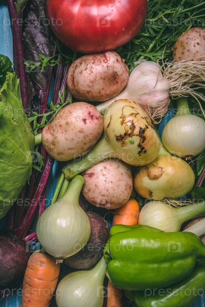Помидор, капуста, лук, картофель, перец, чеснок, морковь и свекла. Овощи в корзине на синем фоне. Копируйте пространство. Здоровая еда