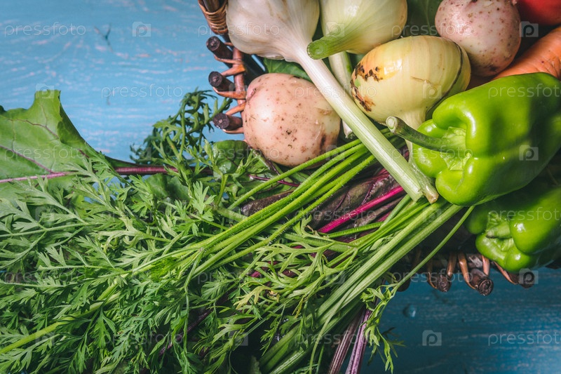 Помидор, капуста, лук, картофель, перец, чеснок, морковь и свекла. Овощи в корзине на синем фоне. Копируйте пространство. Здоровая еда
