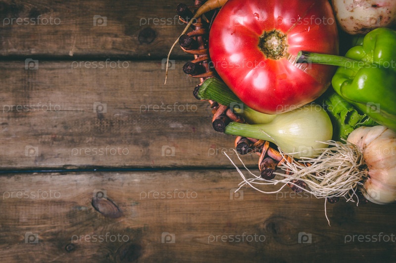 Помидор, лук, картофель, перец, чеснок, морковь и свекла. Овощи в корзине на деревянном деревенском столе. Копируйте пространство. Здоровая еда