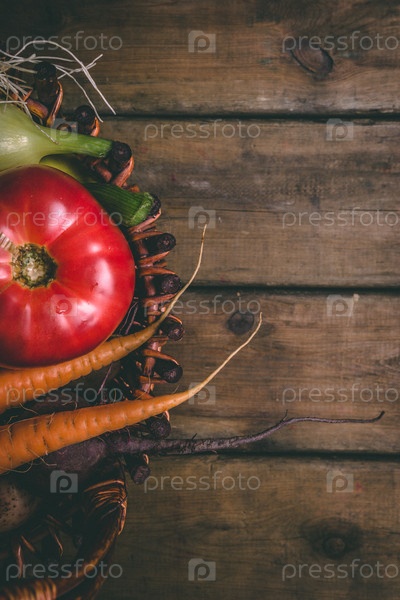 Помидор, лук, картофель, перец, чеснок, морковь и свекла. Овощи в корзине на деревянном деревенском столе. Копируйте пространство. Здоровая еда