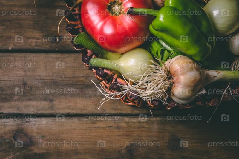 Помидор, лук, картофель, перец, чеснок, морковь и свекла. Овощи в корзине на деревянном деревенском столе. Копируйте пространство. Здоровая еда
