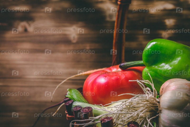 Помидор, лук, картофель, перец, чеснок, морковь и свекла. Овощи в корзине на деревянном деревенском столе. Копируйте пространство. Здоровая еда