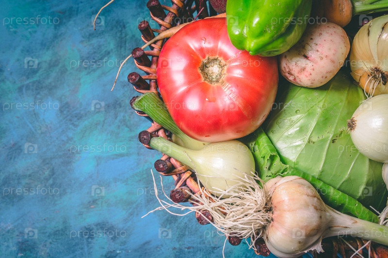 Помидор, капуста, лук, картофель, перец, чеснок, морковь и свекла. Овощи в корзине на синем фоне. Копируйте пространство. Здоровая еда
