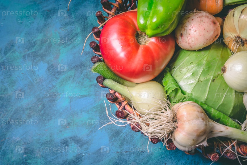 Помидор, капуста, лук, картофель, перец, чеснок, морковь и свекла. Овощи в корзине на синем фоне. Копируйте пространство. Здоровая еда