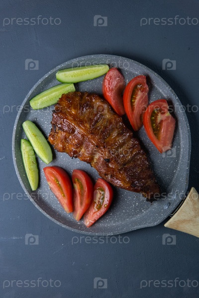 Запеченные свиные ребра с медом лежат со свежими нарезанными помидорами и огурцами на темно-серой бетонной столешнице