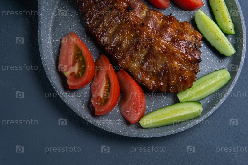 Запеченные свиные ребра с медом лежат со свежими нарезанными помидорами и огурцами на темно-серой бетонной столешнице