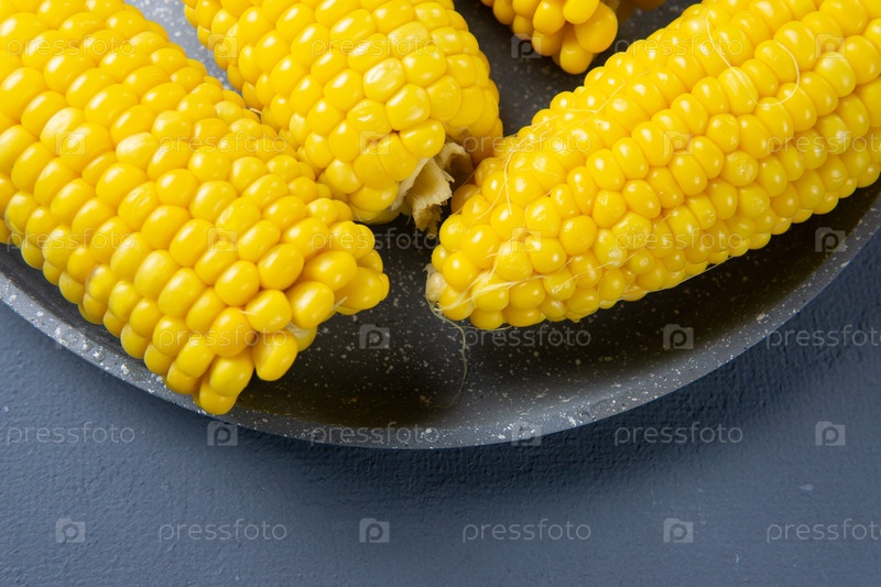 Свежеприготовленные желтые кукурузные початки лежат на сером блюде