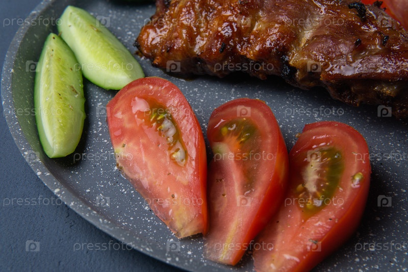 Запеченные свиные ребра с медом лежат со свежими нарезанными помидорами и огурцами на темно-серой бетонной столешнице