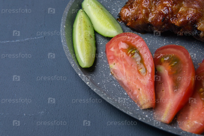 Запеченные свиные ребра с медом лежат со свежими нарезанными помидорами и огурцами на темно-серой бетонной столешнице