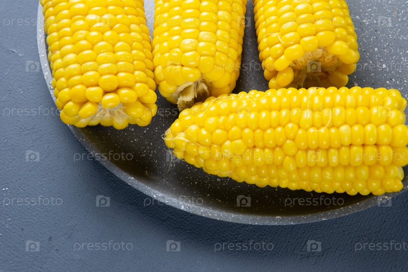 Свежеприготовленные желтые кукурузные початки лежат на сером блюде