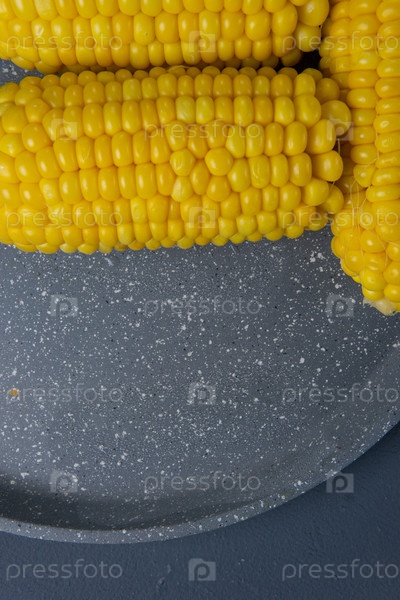Свежеприготовленные желтые кукурузные початки лежат на сером блюде