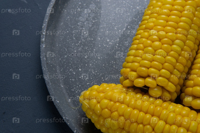 Свежеприготовленные желтые кукурузные початки лежат на сером блюде