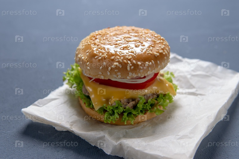 Бургер с говяжьей помадой, салат, кусочек томата и сыра, лук и соус с паприкой в жареной булке с кунжутом