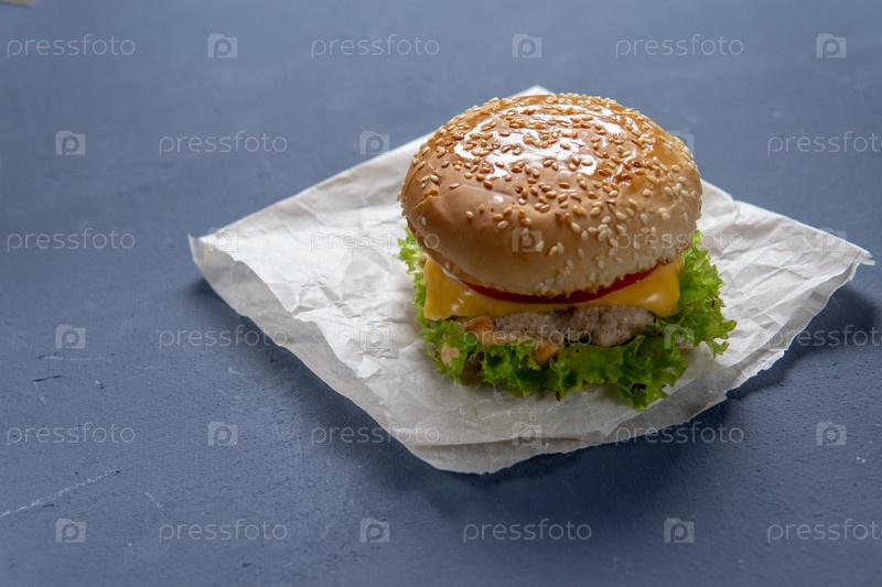 Бургер с говяжьей помадой, салат, кусочек томата и сыра, лук и соус с паприкой в жареной булке с кунжутом