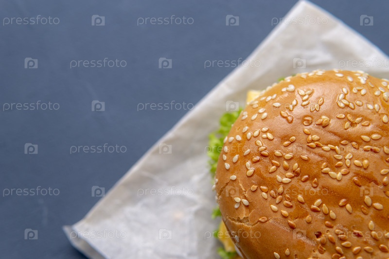 Бургер с говяжьей помадой, салат, кусочек томата и сыра, лук и соус с паприкой в жареной булке с кунжутом