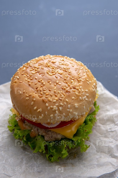 Бургер с говяжьей помадой, салат, кусочек томата и сыра, лук и соус с паприкой в жареной булке с кунжутом