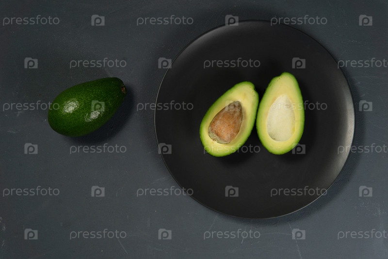 Свежий, сырой авокадо нарезан на черной тарелке