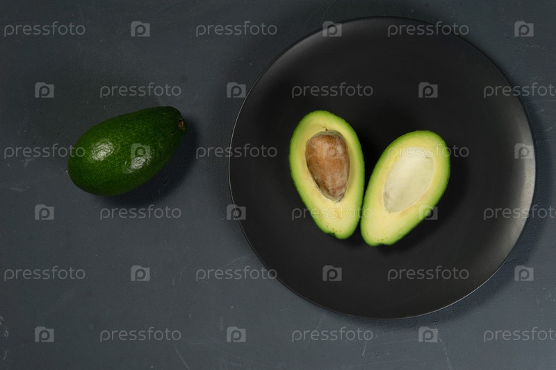 Свежий, сырой авокадо нарезан на черной тарелке