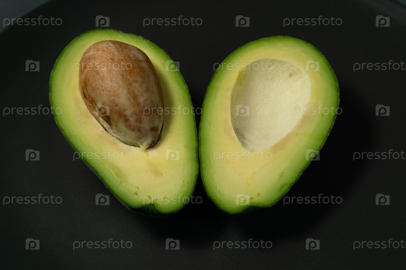 Свежий, сырой авокадо нарезан на черной тарелке