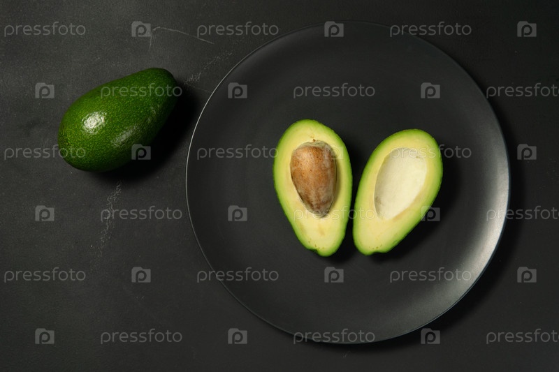 Свежий, сырой авокадо нарезан на черной тарелке