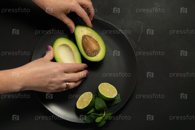 Женщина готовит сырой авокадо и лайм на темном заднем канаве