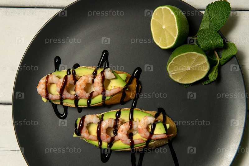 Брусчетта с креветками, авокадо и лаймом на белом деревянном фоне