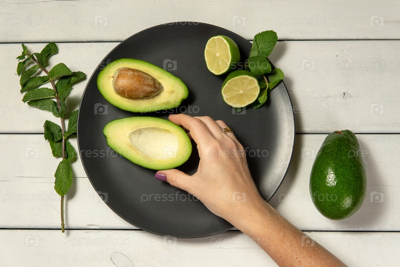 Женщина готовит сырой авокадо и лайм на белом деревянном бэкгроунге