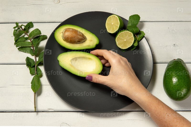 Женщина готовит сырой авокадо и лайм на белом деревянном бэкгроунге